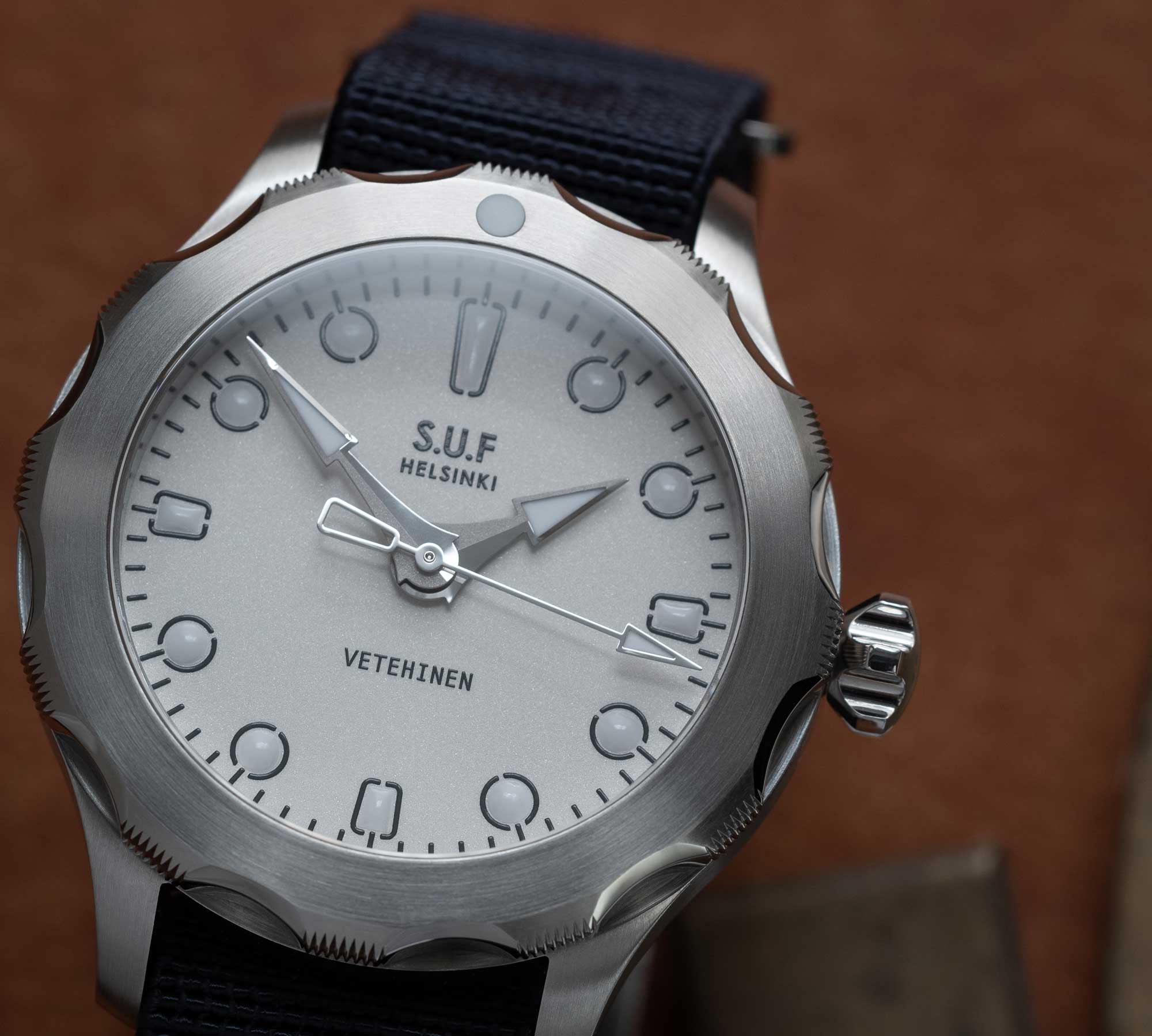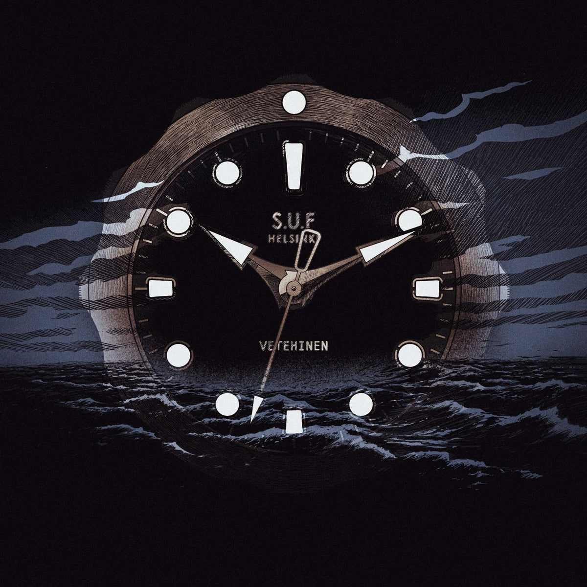 This is just another tale of hard-bitten, but enterprising “sisu” to which S.U.F’s latest creation pays tribute. Water-resistant to 300 metres, the Vetehinen watch is a tiny submarine for your wrist, crafted with high-grade Supra 316L/4435 stainless steel from Finland’s world-renowned steel giant, Outokumpu – forged in Helsinki, impregnated with anti-corrosive nickel mined from the Finnish ground.