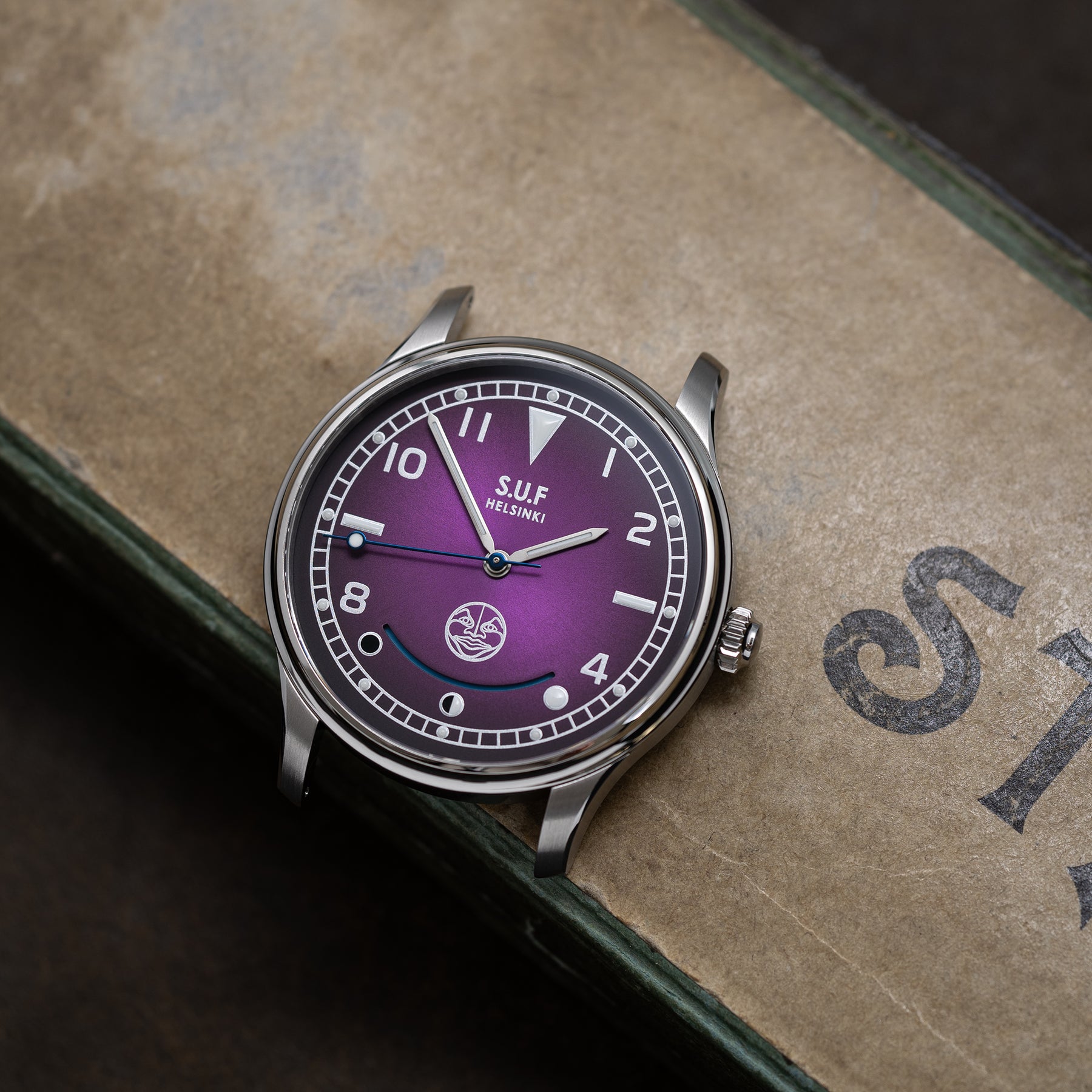 S.U.F Kaaos, a tribute to the exhilarating journey of S.U.F Helsinki and Stepan Sarpaneva's tireless efforts in shaping two watch brands of international repute. To commemorate this milestone, S.U.F Helsinki and Sarpaneva Watches converge to create a timepiece like no other. Behold the S.U.F watch, now adorned with a captivating moon phase complication, featuring Sarpaneva's iconic moon face for the very first time.